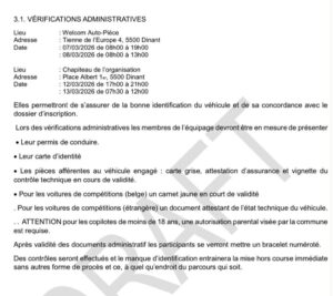 Signalons que pour être admis au départ, le véhicule doit être en ordre administrativement pour circuler sur la voie publique lors d’un événement sportif! ( Carnet jaune ASAF non valide est OK tant que la date du CT civil est en ordre ( Rouge ou vert ).